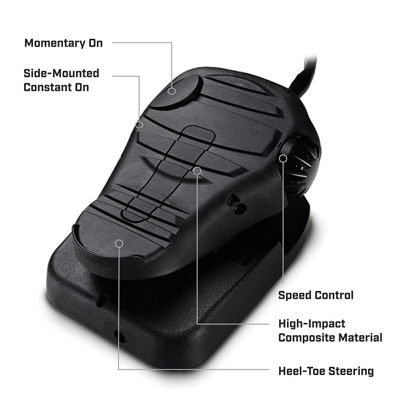 Get heel/toe control of the motor with this ultra-responsive foot pedal that includes speed control and momentary and constant on/off. Made with a high-impact composite material for unparalleled durability.